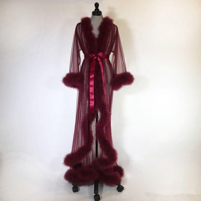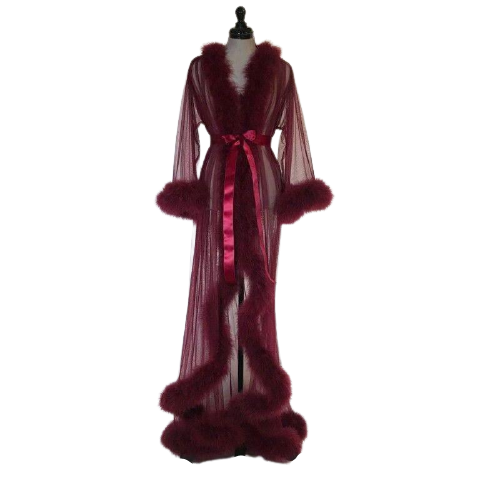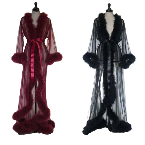 Bata de noche de manga larga hecha a mano, con transparencias y plumas.