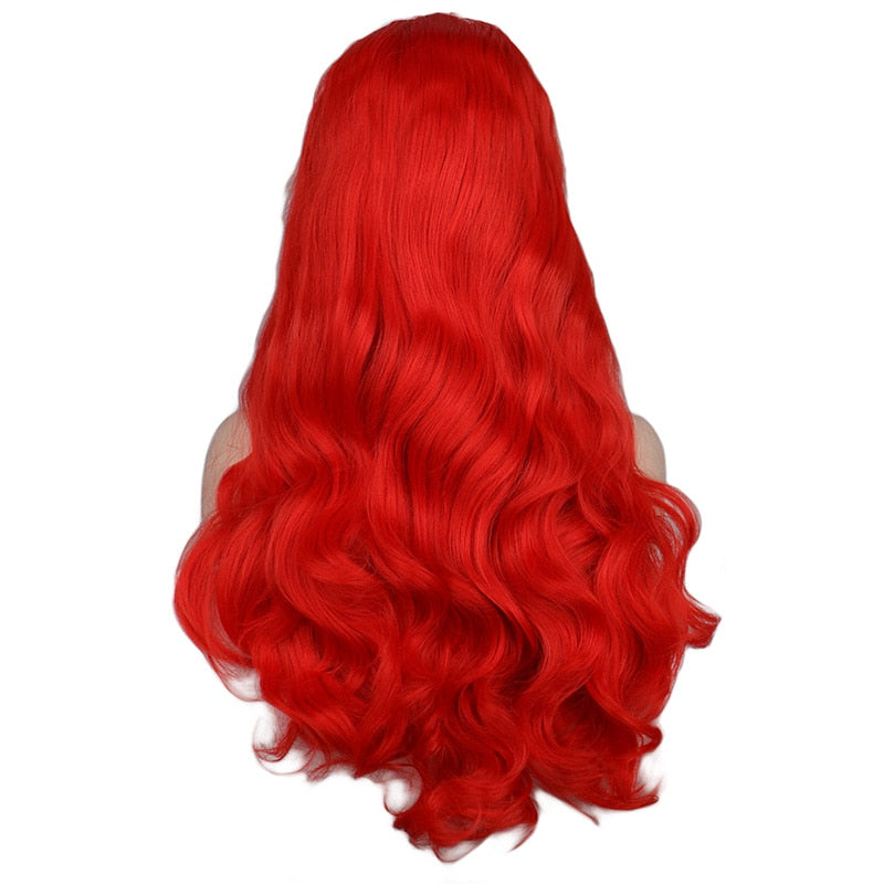 Peluca hecha a mano de pelo sintético largo ondulado rojo con encaje frontal