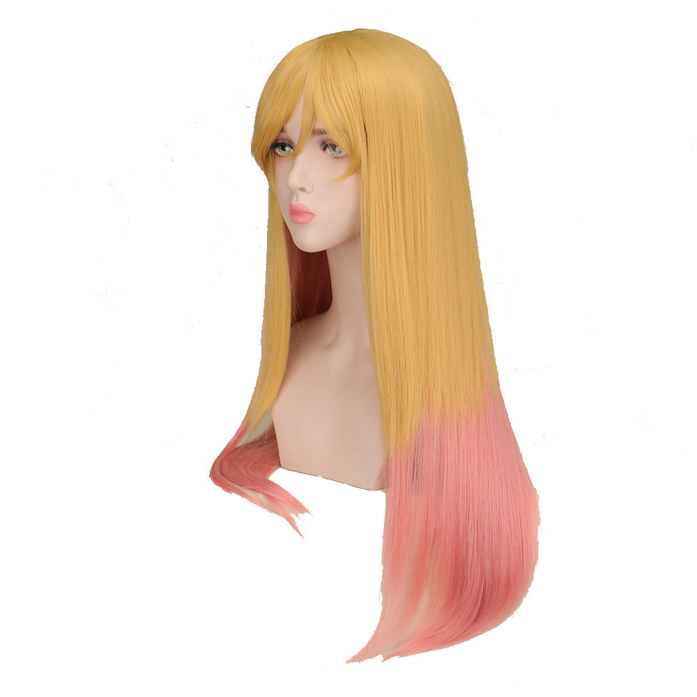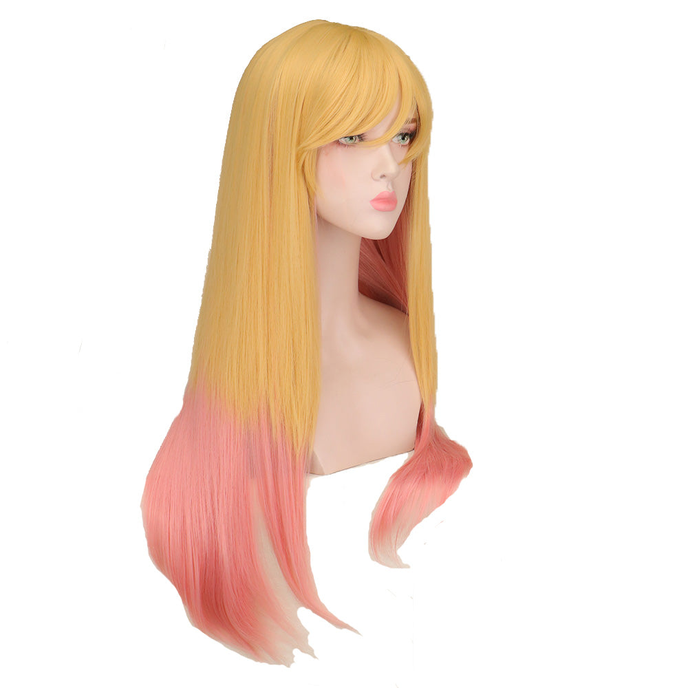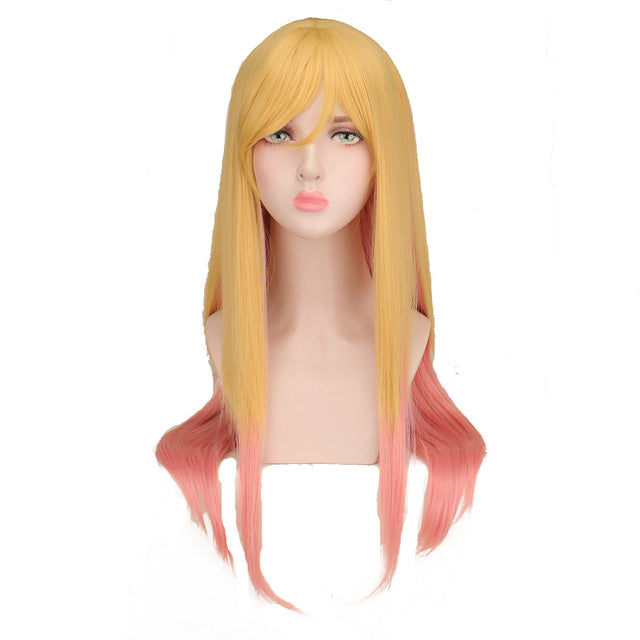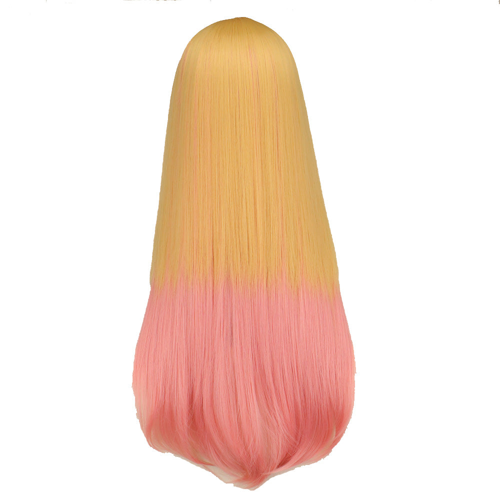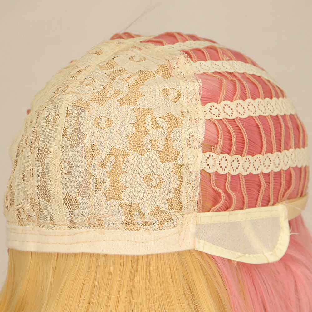 Peluca hecha a mano de pelo sintético, liso largo en doble color rubio y rosa claro.