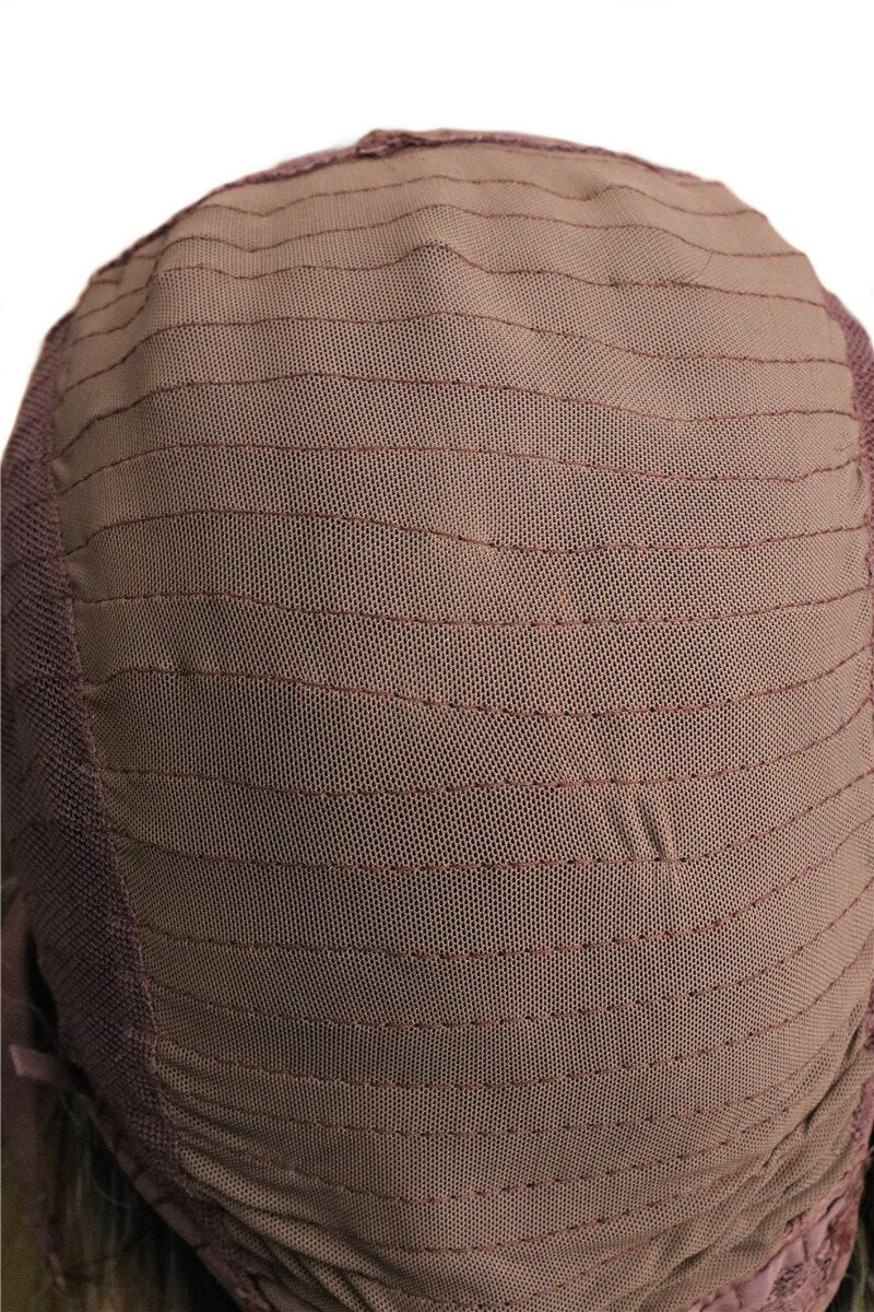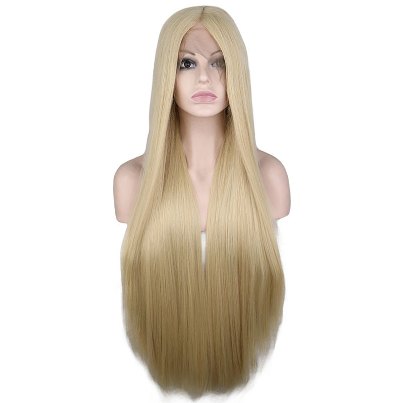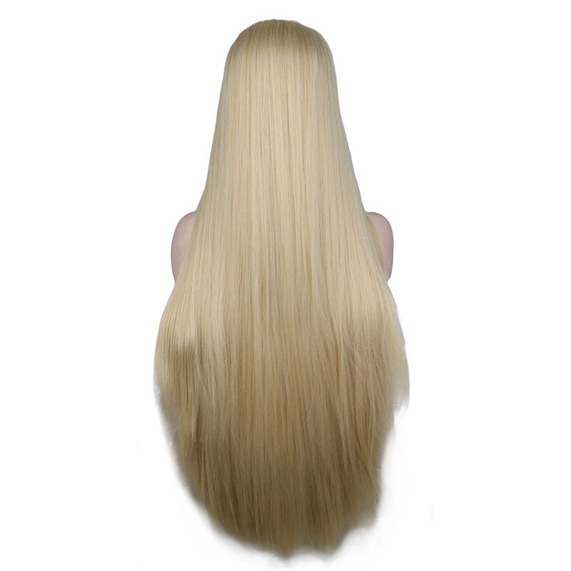 Peluca hecha a mano de pelo sintético rubio liso largo con rayita natural y con encaje frontal.