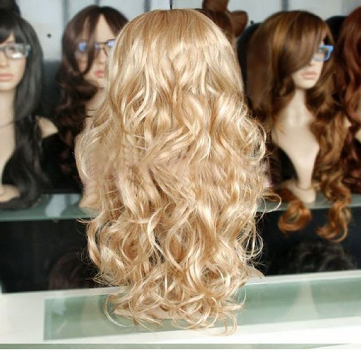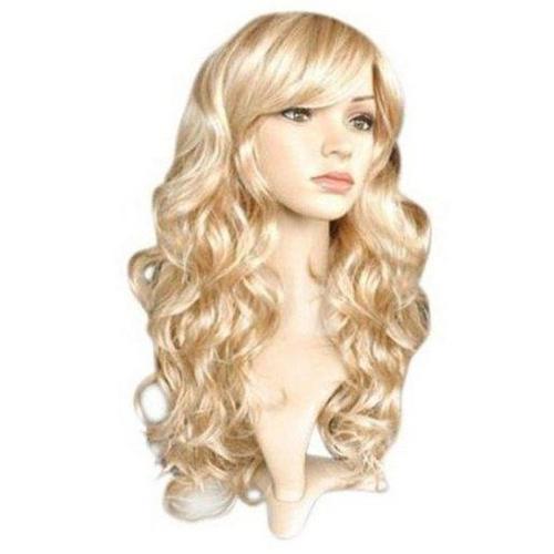 Peluca hecha a mano de pelo sintético largo ondulado con flequillo.