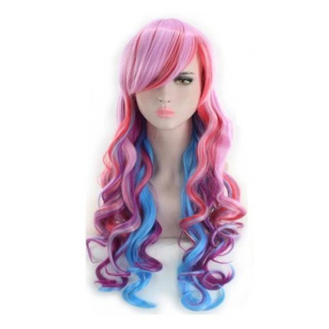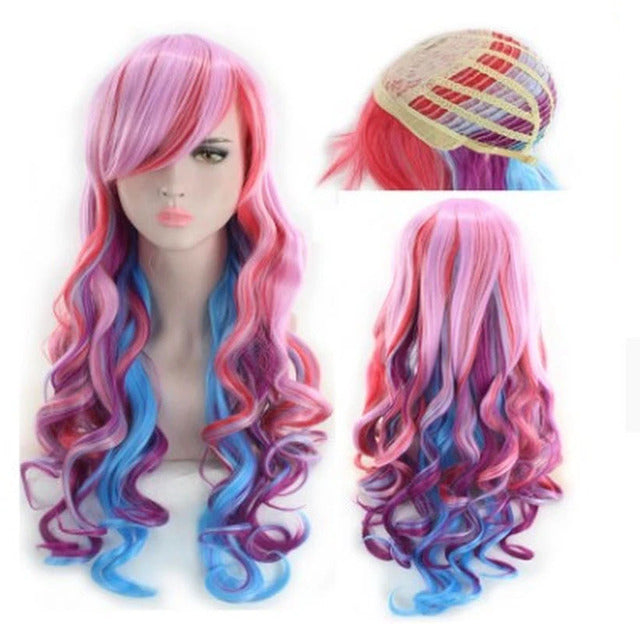 Peluca hecha a mano de pelo sintético ondulado largo y en cuatro colores, púrpura, azul, rojo y rosa.