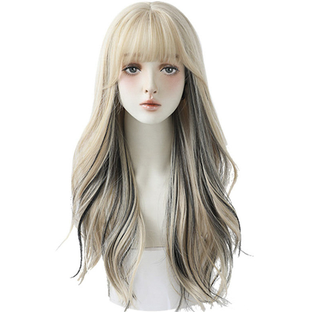 Peluca hecha a mano de pelo sintético, largo con flequillo, Ondulado a doble color rubio y negro.