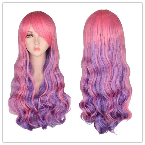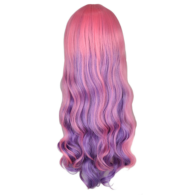 Peluca hecha a mano de pelo sintético ondulado largo y en doble color rosa y púrpura.