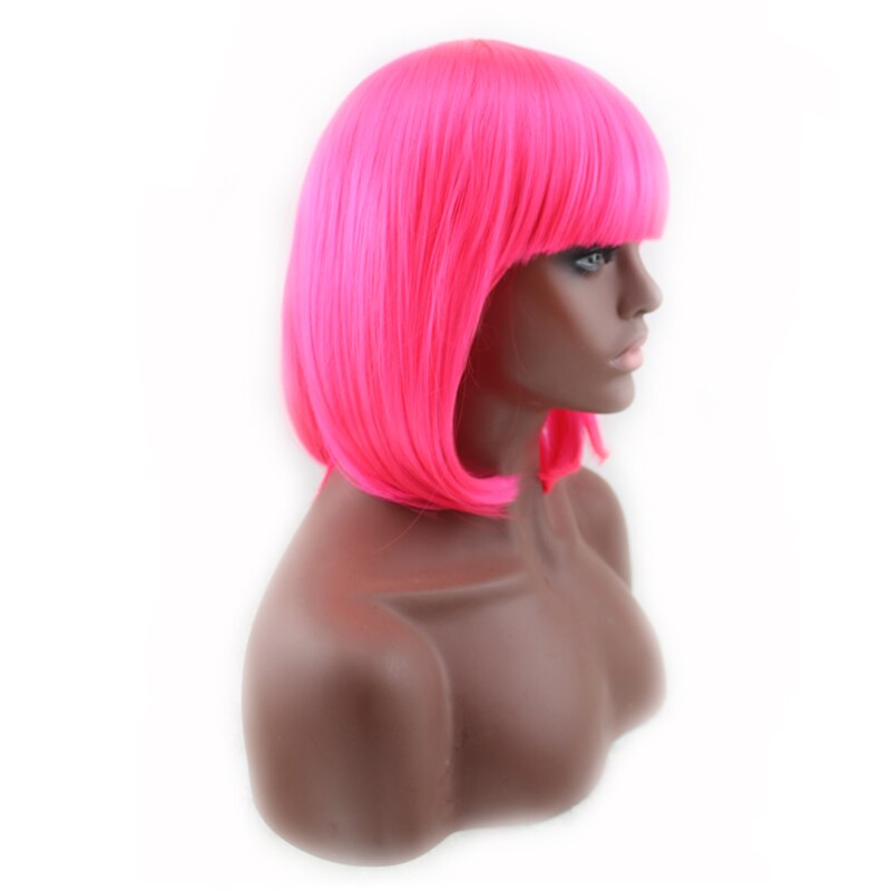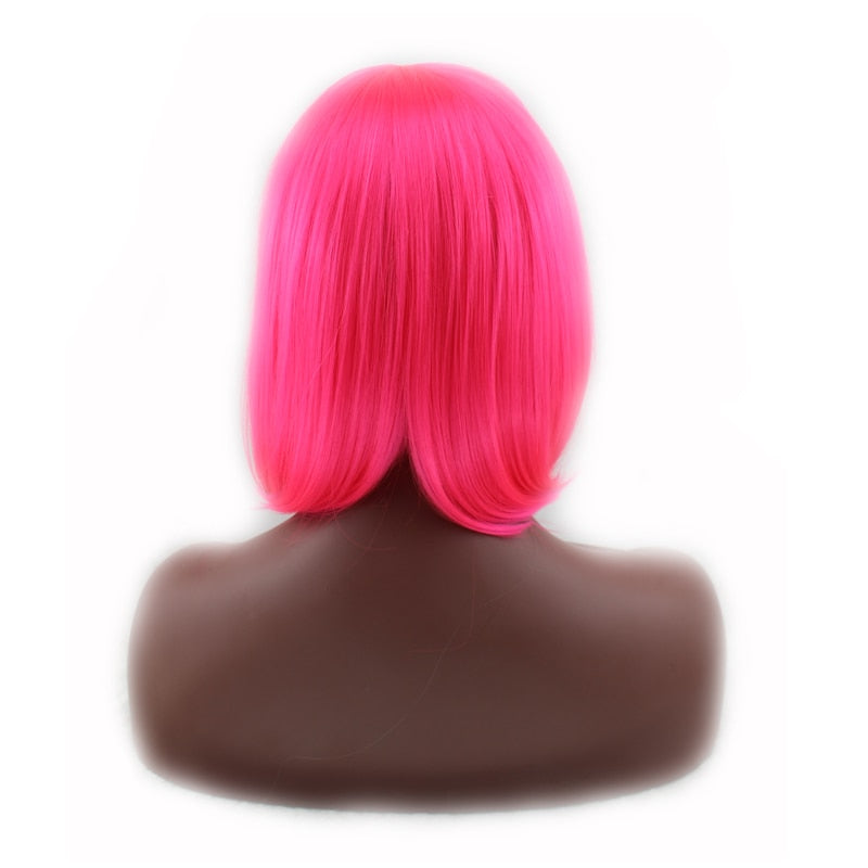 Peluca de pelo sintético fucsia liso corta hecha a mano.