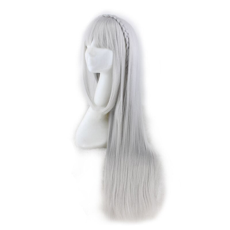 Peluca hecha a mano de pelo sintético liso largo con una trenza gris platino