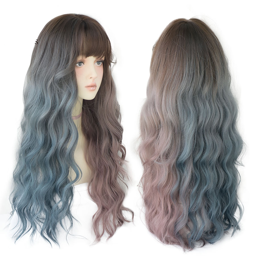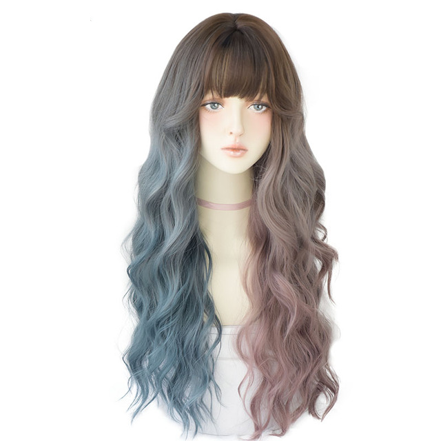 Peluca hecha a mano de pelo sintético, largo ondulado con flequillo, a triple color azul, marrón y rosado.