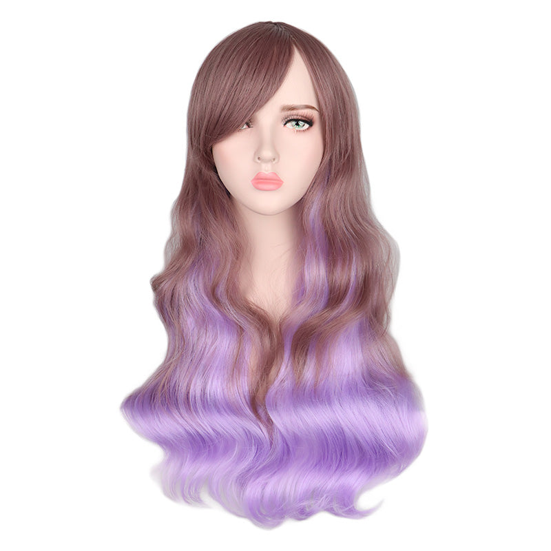 Peluca hecha a mano de pelo sintético ondulado largo y en doble color marrón y rosa.