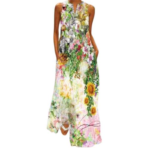 Vestido largo. Cuello en V. Sin mangas. Multicolor.