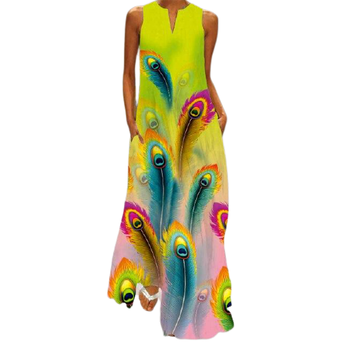 Vestido largo. Cuello en V. Sin mangas. Multicolor.