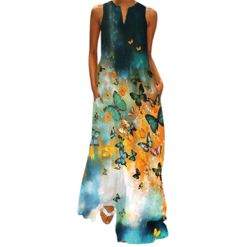 Vestido largo. Cuello en V. Sin mangas. Multicolor.