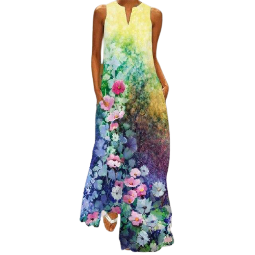 Vestido largo. Cuello en V. Sin mangas. Multicolor.