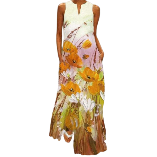Vestido largo. Cuello en V. Sin mangas. Multicolor.