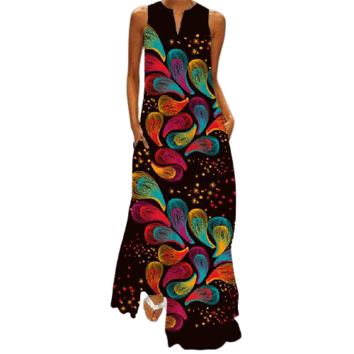 Vestido largo. Cuello en V. Sin mangas. Multicolor.