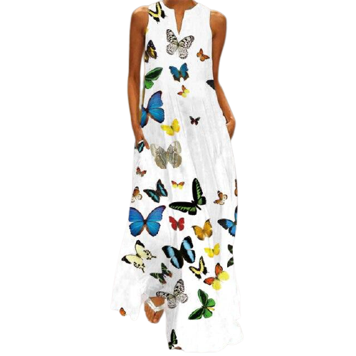 Vestido largo. Cuello en V. Sin mangas. Multicolor.