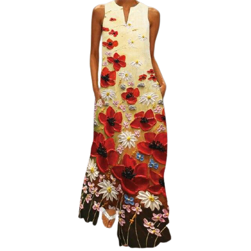Vestido largo. Cuello en V. Sin mangas. Multicolor.